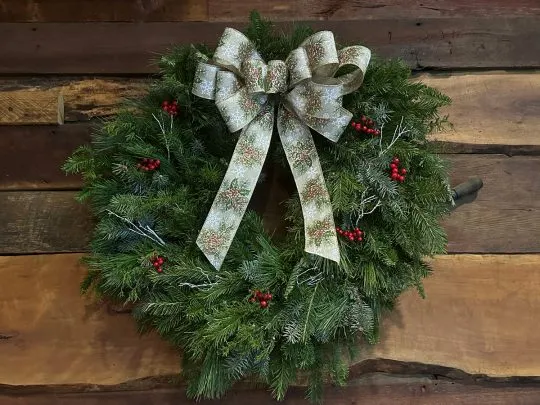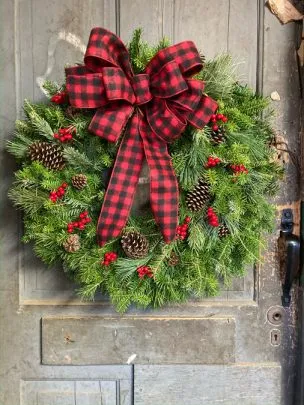 Plain or fully decorated, wide variety of ribbon colors, real pinecones, and decorations to choose from.